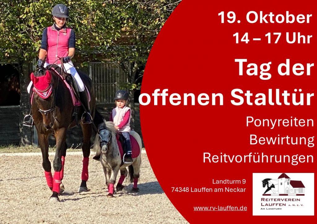 Am 19. Oktober veranstalten wir wieder einen Tag der offenen Stalltür – mit geführtem Reiten, leckerer Bewirtung und Reitvorführungen. Die Teilnahme am geführten Reiten ist nur mit Buchung unter folgendem Link möglich: