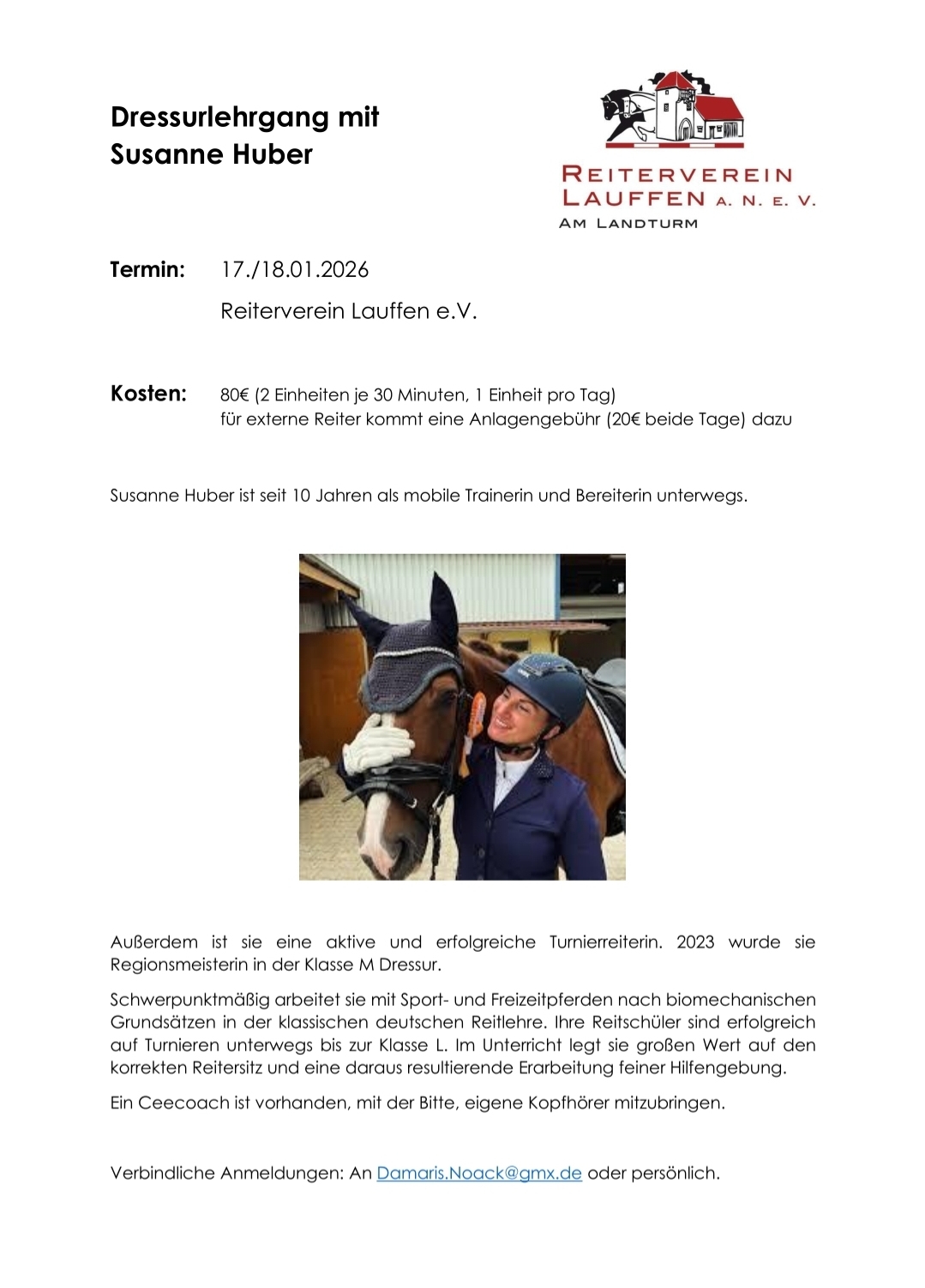 Dressurlehrgang am 17./18.01.2026 mit Susanne Huber Dressurlehrgang am 17./18.01.2026 mit Susanne Huber 2. November 2025 Reiterverein Lauffen