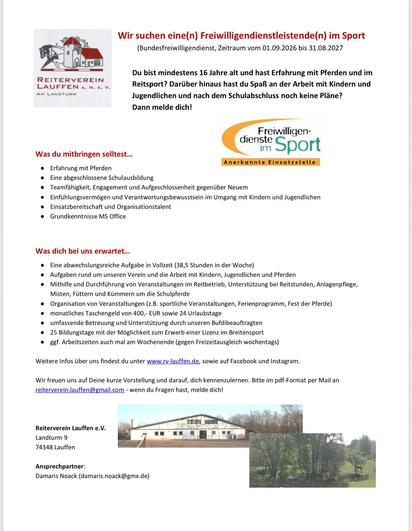 Bundes-Freiwilligendienstleistende(r) gesucht! Bundes-Freiwilligendienstleistende(r) gesucht! 16. Februar 2026 Reiterverein Lauffen